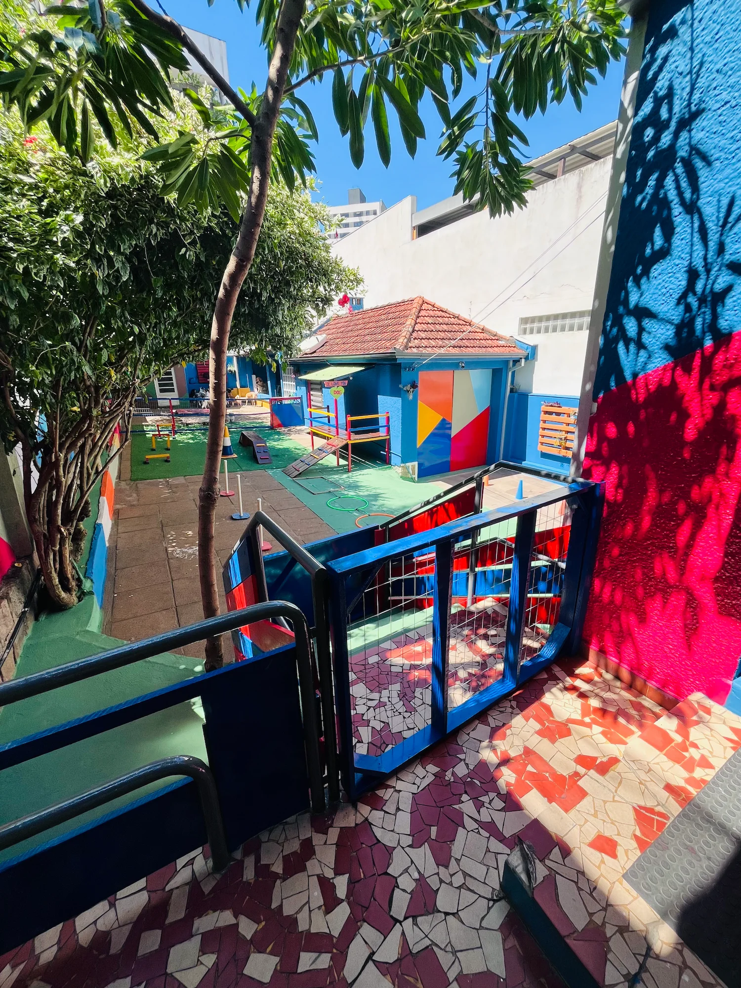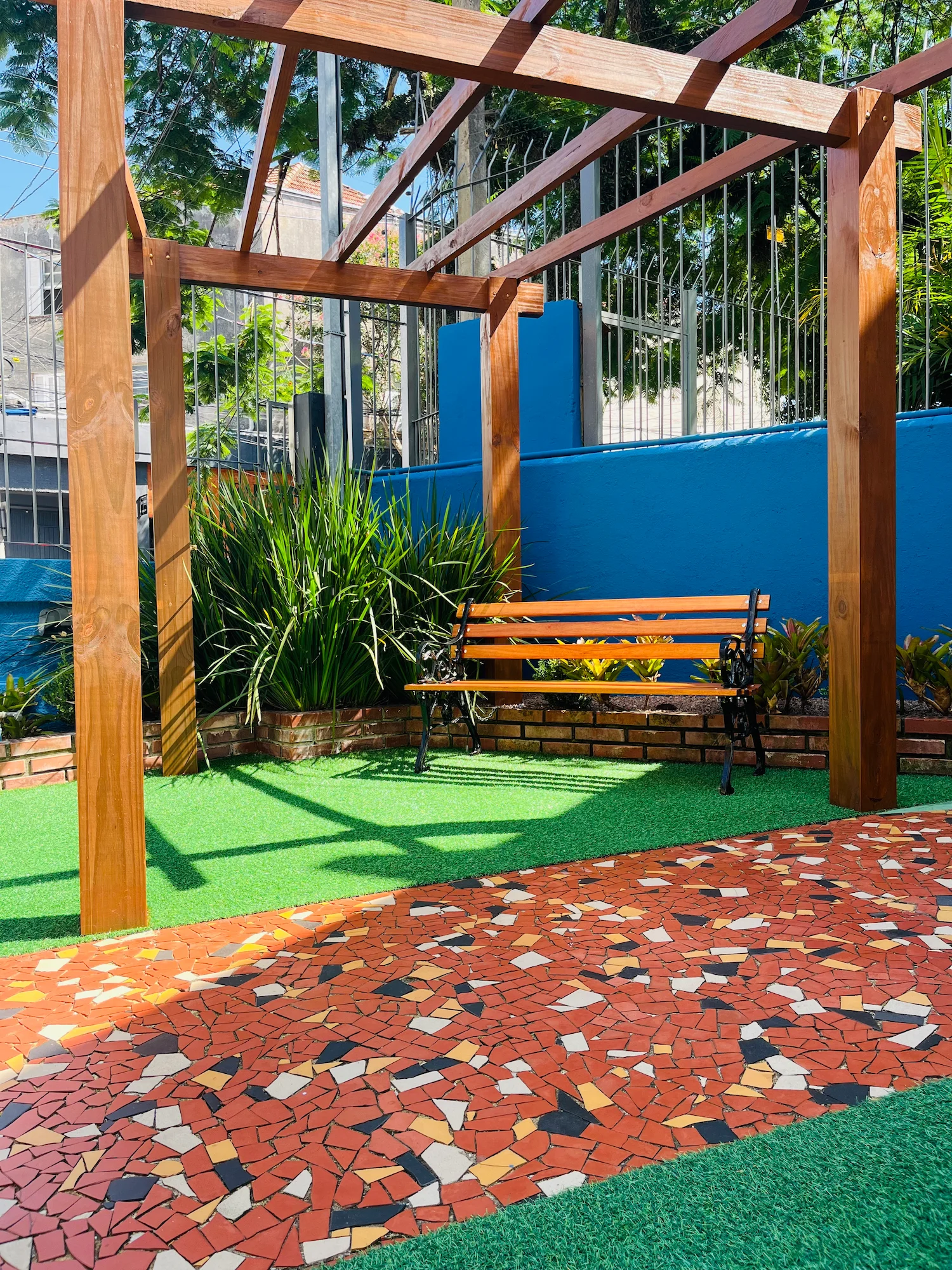 - Espaços cobertos e ao ar livre com sombra de árvores;